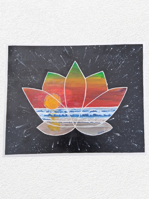 🌅 Le lotus stylisé, illuminé par un soleil levant au bord de la mer, incarne une prière silencieuse à l’univers, une offrande à la renaissance et à la paix intérieure.