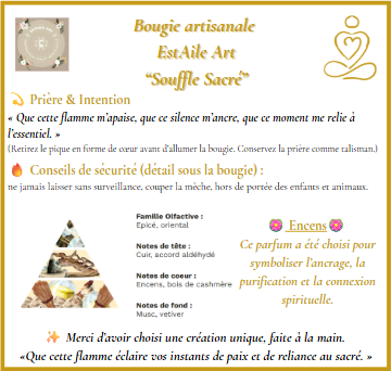 ✨ Souffle Sacré n’est pas une simple bougie, c’est une œuvre spirituelle et décorative, pensée comme un rituel miniature pour accompagner vos méditations et vous relier à l’essentiel.