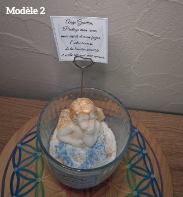 Coulée en cire de soja naturelle et parfumée aux essences fines de Grasse, elle renferme un ange délicat, porteur d’amour et de guidance.